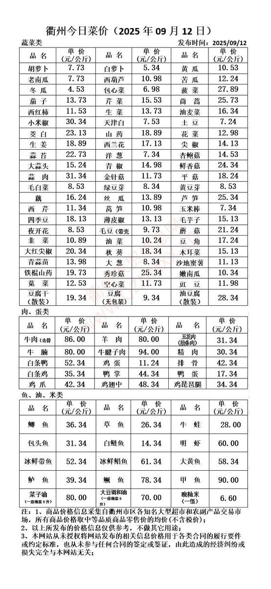 衢州今日菜价